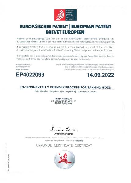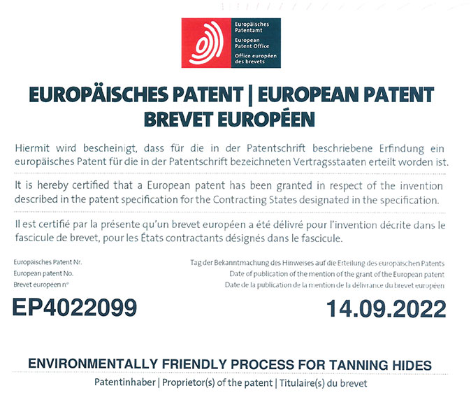 Siamo orgogliosi di annunciare di aver ottenuto due importanti riconoscimenti quali il BREVETTO ITALIANO ed il BREVETTO EUROPEO, frutti di un enorme lavoro svolto in questi ultimi anni nella ricerca e nello sviluppo di tecnologie per ridurre al massimo l'impatto ambientale nell'ambito della concia.