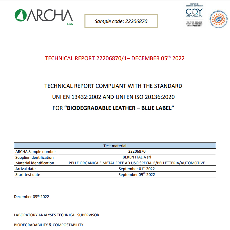 Il materiale di prova è conforme ai requisiti della norma UNI EN ISO 20136:2020 per il grado di biodegradabilità da micro-organismi, fornendo un grado medio di biodegradazione relativa 86,7% (al valore di plateau).
